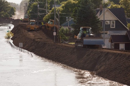 picture showed the scene that people were facing the flood in order to repair the broken part of the levee