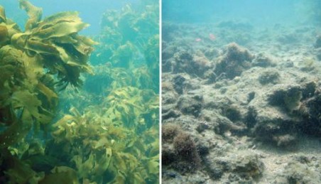 The photo above compares ocean floor in a healthy zone (left) and a dead zone (right). Eutrophication leads to dead zones like the one above as a result of algal growth. Algae grow and die at high rates in nutrient rich areas and use up the nutrients. These algal blooms block the sun from penetrating the water’s surface inhibiting photosynthesis. When algae die they sink to the bottom where bacterial composition takes place, a process that uses much of the Oxygen in the water, leading to asphyxiation and the death of marine life.