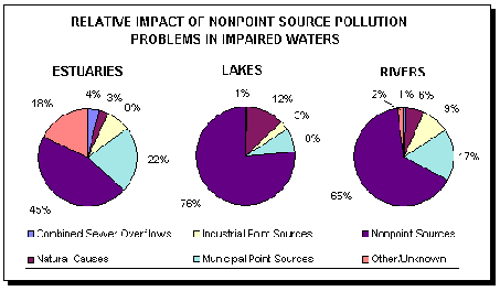 The biggest threat to estuaries, lakes, and rivers comes from Non-point source pollution. Of the waterways that have been listed as impaired by the EPA under the CWA, it has been found that Non-point source pollution is the biggest contributor causing the waterways to fail to meet regulatory standards.
