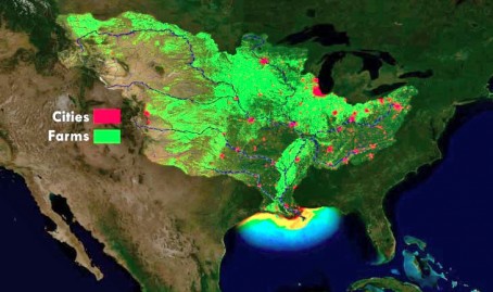 The photo above shows the tributaries, agricultural land, and urban centers connected to the Mississippi River Basin. These waters lead directly to the Gulf of Mexico. Agricultural runoff leaves the farms into the water system and ends up in the Gulf of Mexico.