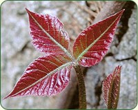 Leaf: Poison ivy has three shiny green leaves with a red stem and grows as a shrub. It is can also be a vine on trees and buildings