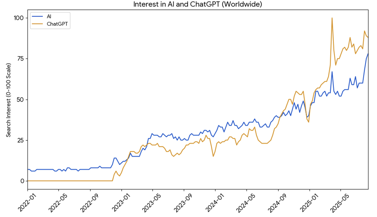 Figure 1. The rise in worldwide search interest for the terms “AI” and “ChatGPT” since 2022. The rapid spike beginning in late 2022 visually represents the rapid integration of AI into the public consciousness.