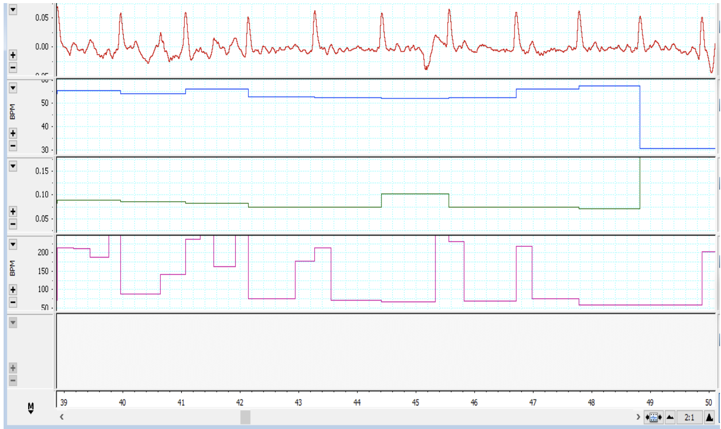 Figure 1. Sample 11-second recording screenshot of heart and respiratory rate at rest using a finger pulse transducer and a respiratory belt transducer.