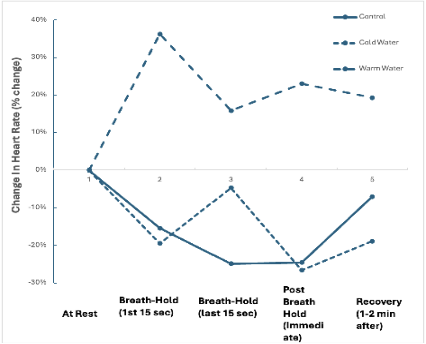 The heart rate of one participant was measured throughout the duration of the experiment. A finger pulse transducer and a respiratory belt transducer were connected to the participant and configured to PowerLab to display respiratory rate and heart rate in real time in LabChart7. To ensure proper setup and accurate data acquisition before the start of the experiment, a test run was conducted for about a minute, during which the participant’s heart rate was monitored at rest and during a breath hold. Once deemed successful, the participant began the submersion process in room temperature water, cold water (6 degrees Celsius), and warm water (30 degrees Celsius). Once data recording began, the participant remained at rest for approximately 30 seconds to obtain a resting heart rate. After 30 seconds, the participant submerged their face in a medium-sized tub of tap water for roughly a minute or until they needed to come up. After another 2-3 minutes of recording the recovery period, the recording stopped, and the trial would be finished. The next recording would begin in approximately 3-5 minutes or when the participant was ready to proceed. This process was repeated for each submersion. Means of heart rate data (only) were calculated using LabChart7 for resting heart rate, 15 seconds after water submersion, 15 seconds before the participant came up, post-breath hold (immediately after coming back up), and during the 2-3 minute recovery period, when data were still being collected. Graphing and data input were done in Microsoft Excel.