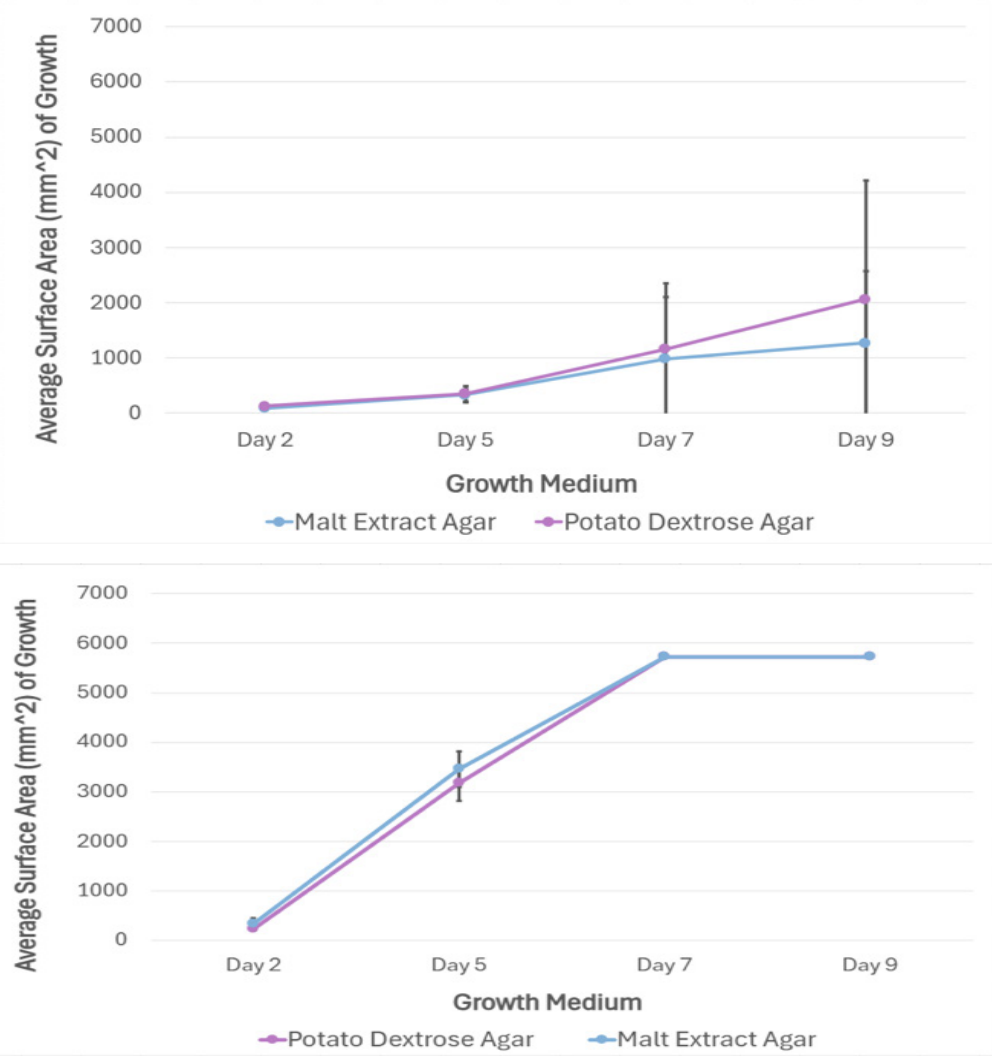 Figure 1. Average surface area (mm2) (± st. deviation) of fungal endophyte growth across 9 days as a function of growth medium for (A) Quercus macrocarpa root tissue and (B) Acer rubrum bark, with the blue line representing Malt Extract Agar (MEA) growth medium (n=10) and the pink line representing Potato Dextrose Agar (PDA) growth medium (n=10).