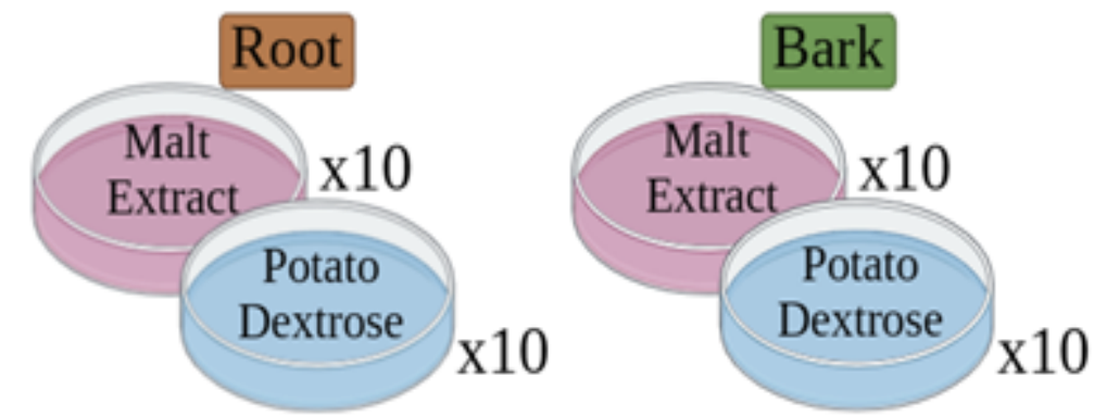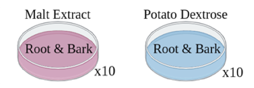Figure 3. Setup for endophyte growth for differing tissue locations as a function of growth medium. Root and bark tissue colonies were separated into 20 equal samples each using sterilized tweezers. 10 replicates of root tissue alone were cultured on potato dextrose agar (PDA) plates. Another 10 replicates of root tissue were cultured on malt extract agar (MEA) plates. In the same manner, 10 replicates of bark tissue alone were cultured on PDA and another 10 on MEA.