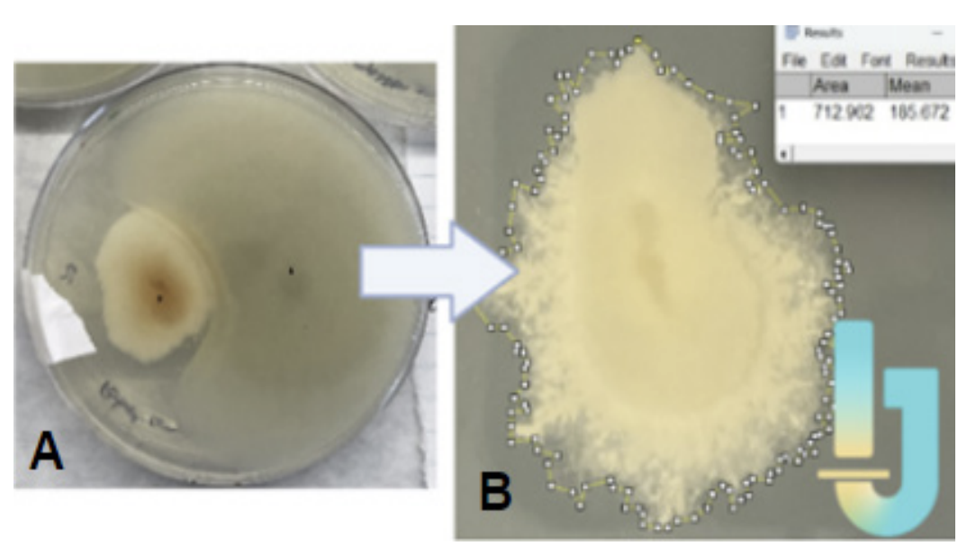 Figure 5. Measurement of fungal growth surface area using ImageJ software. A) Photograph of a petri dish containing a fungal culture plate. B) Screen capture from ImageJ showing digital representation of a culture plate with dotted outline indicating the measured area of interest. Photos were imported into ImageJ and calibrated with an included ruler to allow accurate area measurement determination by outlining the growth border.