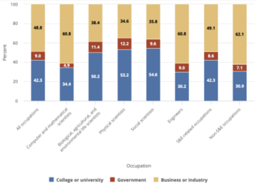 Figure 1. Fields of employment for doctoral recipients are distributed across various STEM fields—source: NCSES, Science and Engineering Indicators 2024.