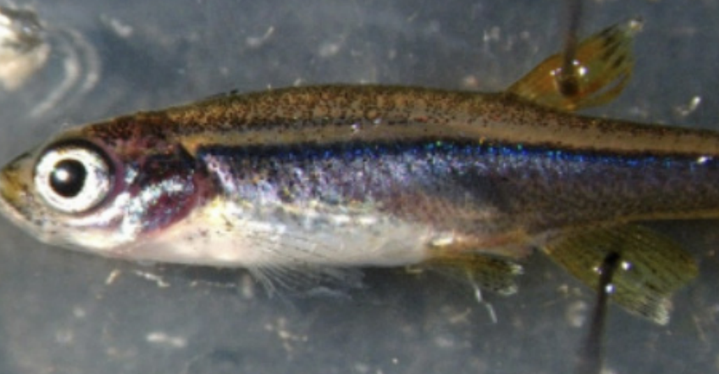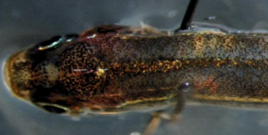 Figure 2.1. Dorsal Imaging of Tanichthys albonubes. A dorsal view of the front half of Tanichthys albonubes (White Cloud Mountain Minnow) under bright light at 12x magnification, freshly euthanized with MS222.