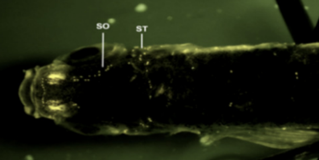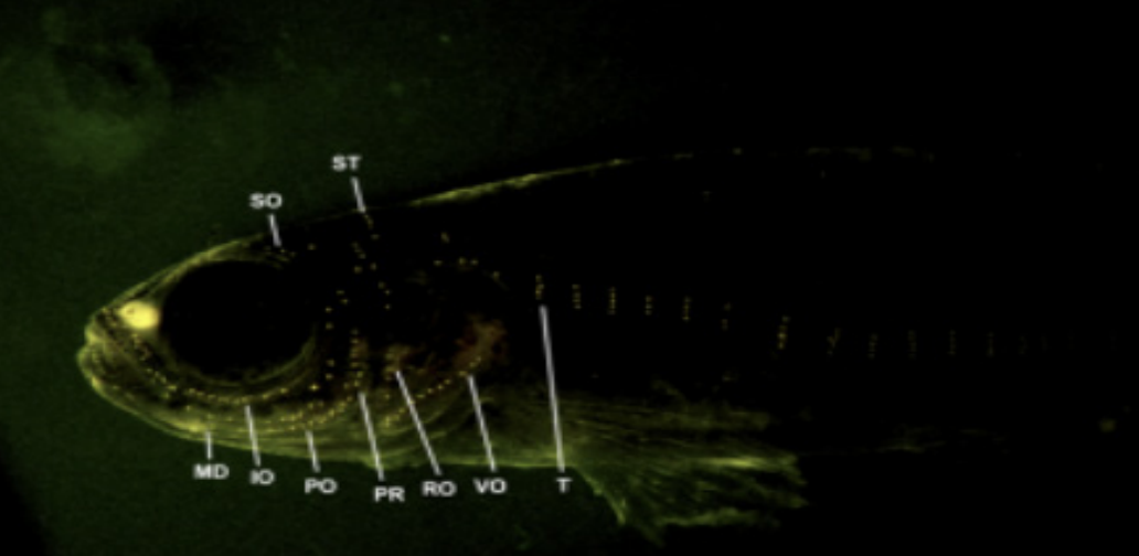 The fluorescence of neuromasts decreases, requiring Figures 2.2 & 2.3 to be supplied by other researchers conducting the same experiment. It can be seen that the localization of neuromasts along the head mirrors that of C. auratus, with ST, RO, and VO neuromasts occurring on the head, which are not present in all fish (Webb, 2011). Additionally, the neuromasts along the trunk mirror those of C. auratus, with linear rows of superficial neuromasts ventrally along the trunk scales. This finding supports the hypothesis that the lateral line morphology of T. albonubes resembles that of its distant relative, C. auratus, raising the question of whether other relatives in the Cypriniformes order exhibit these similarities as well.