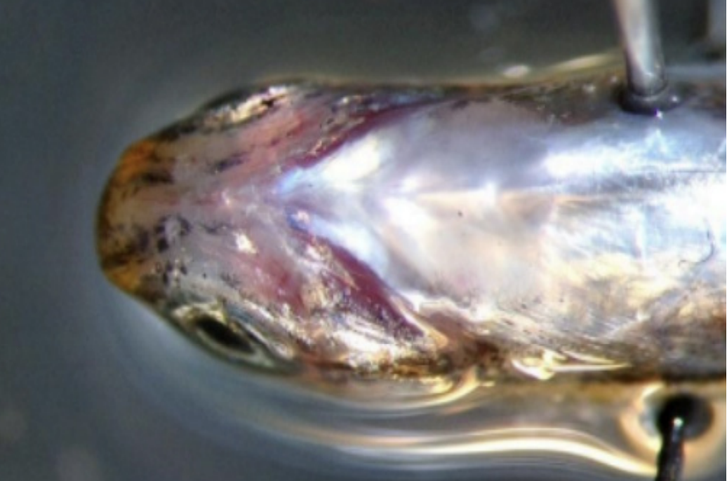 Figure 3.1. Ventral Imaging of Tanichthys albonubes. A ventral view of the head of Tanichthys albonubes (White Cloud Mountain Minnow) under bright light at 12x magnification, freshly euthanized with MS222.