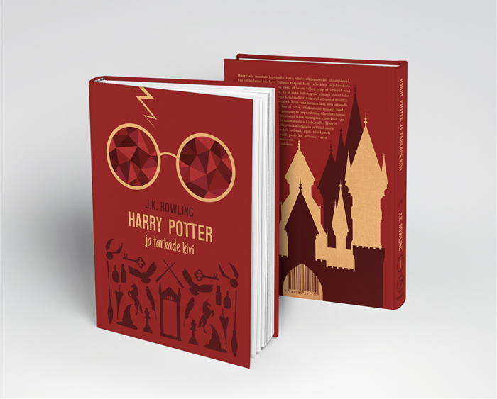Five months later, the new Estonian version of The Sorcerer’s Stone hit bookstores wrapped in the red book jacket Sarekanno created. Her design features the iconic Harry Potter symbols—his round glasses and lightning bolt scar—on the top half of the book cover. The images within the spectacles, the overall color, and the symbolic patterns at the bottom half of the cover change with each book in the series.