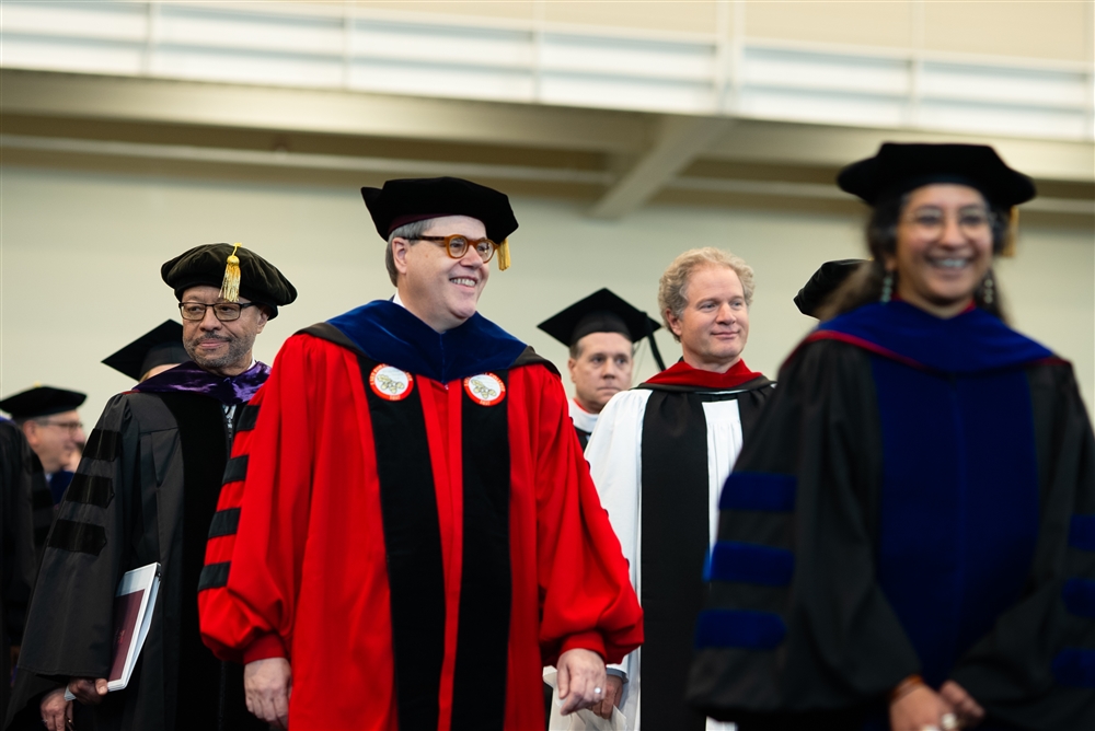 Led by bagpipers, the procession began with Faculty Marshal and Professor of French Cynthia Hahn, who carried the College Mace, followed by student delegates, staff delegates, college and university delegates, faculty delegates, the Board of Trustees and past Presidents David Spadafora and Stephen Schutt, former Interim President Robert Krebs, and Sosulski.