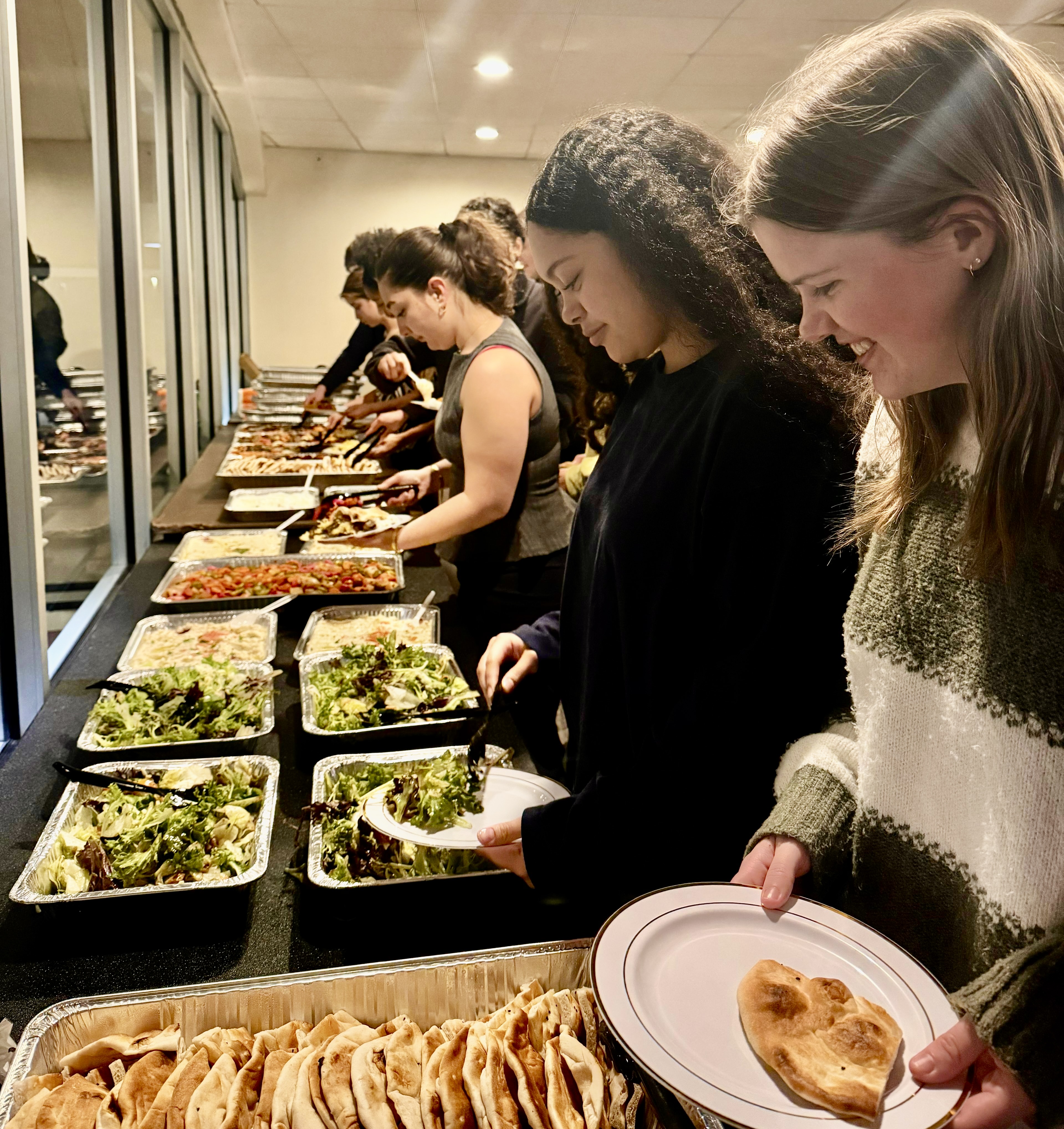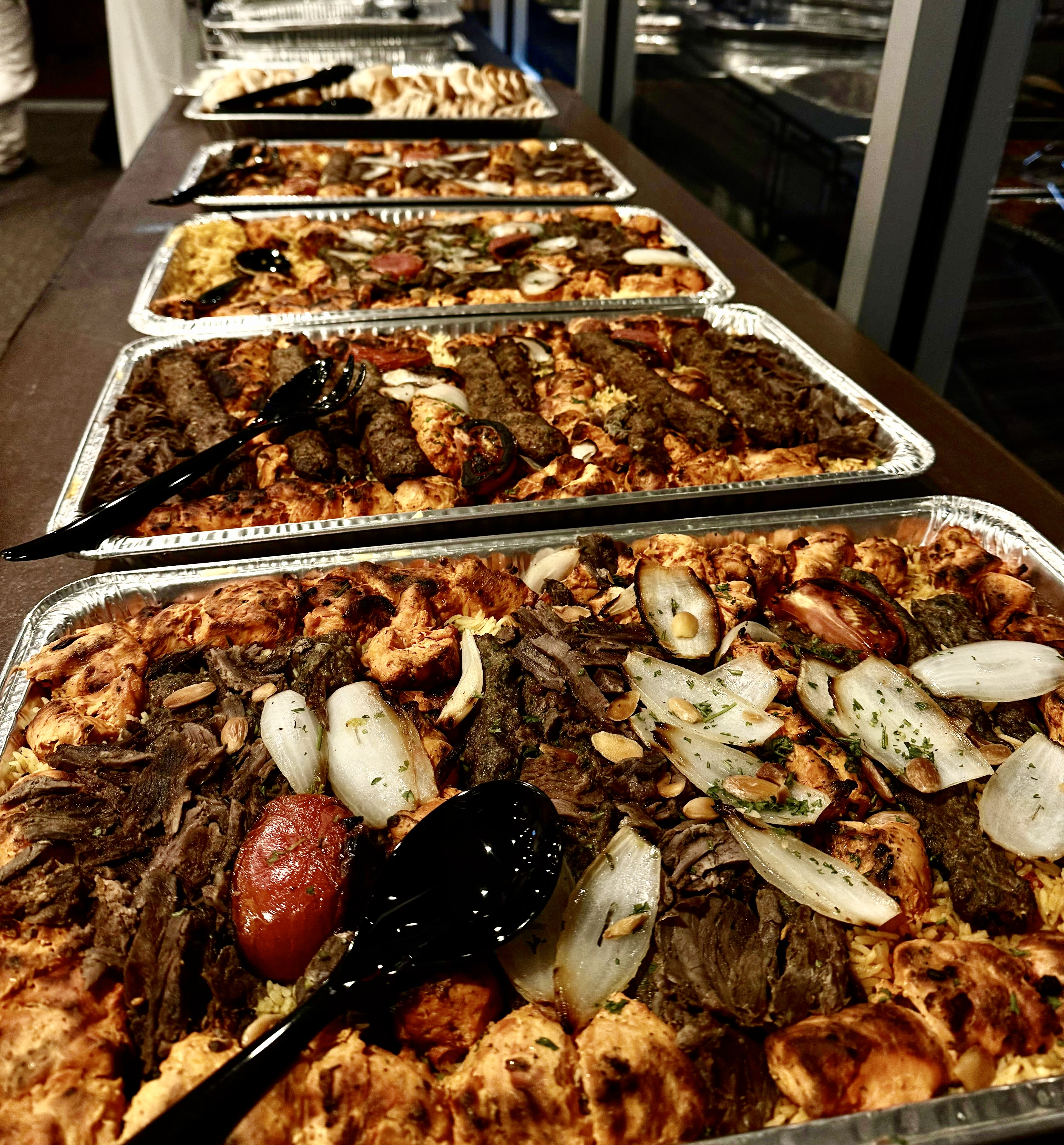 By sunset on the second day of Ramadan, February 19, the tables were set. Dates were arranged on tables; food from Al Bawadi Grill and sweets from Selma’s Sweets were placed on the buffet. Board members and volunteers moved quickly but gently, checking labels, adjusting tablecloths, and greeting early arrivals. Some students came because they were fasting. Others came because they were curious about the event to experience good food and friendly company.