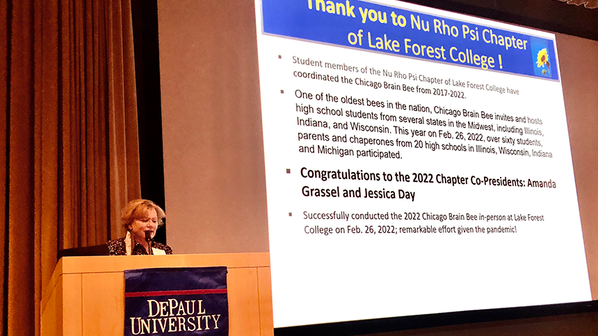 Jessica Day ’22, a biochemistry and molecular biology and neuroscience senior, and Amanda Grassel ’23, a neuroscience junior, were also recognized for their outstanding leadership as the current co-presidents of the College’s chapter for Nu Rho Psi, the national neuroscience honor society, which just capped five years of community service by organizing the Chicago Brain Bee on behalf of CSfN for this part of the Midwest.