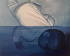 A: “I used two different media. At first, I started with acrylic, so the blue pieces that feel much more representational are the ones in acrylic. Then, I decided to sort of shift my work, and I started to increasingly abstract the paintings. At that point, I also shifted to a material called flashe—it’s a pigment that’s used for creating signs and it’s super matte, so there’s no shine to it at all.”