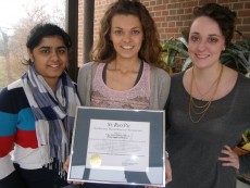 Alumni Michael Zorniak ’07 and Emily Hankosky ’09, who were attending the meeting, accepted the award on behalf of the College. The plaque arrived on campus last week and was officially accepted by executive board members President Vicky Egedus ’14, who authored the application, Vice President Rida Khan ’14, and Secretary Kayla Huber ’16.