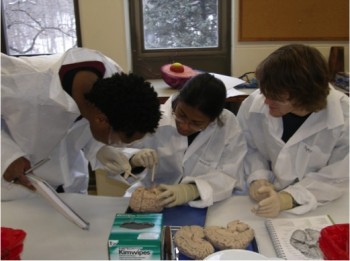 Menzi Mhlanga ’11, Madhavi Senagolage ’12 and Pete Sullivan ’12 (left to right) studying the human brain in a core class called Molecular Neuroscience.