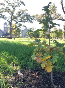 Volunteers spent part of their Saturday, October 3, finding a home for one bur oak, two red oaks, two white oaks, and one bitternut hickory in the triangular prairie in front of the Mohr Student Center.
