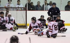 “Almost 40 physically disabled athletes chased the puck around the ice and slammed each other into the boards while riding specially designed sleds during the exciting hockey game.